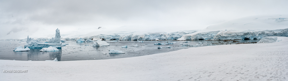 landscape which stretches as far as the eye can see. The ice flow is occupied by some Gentoo