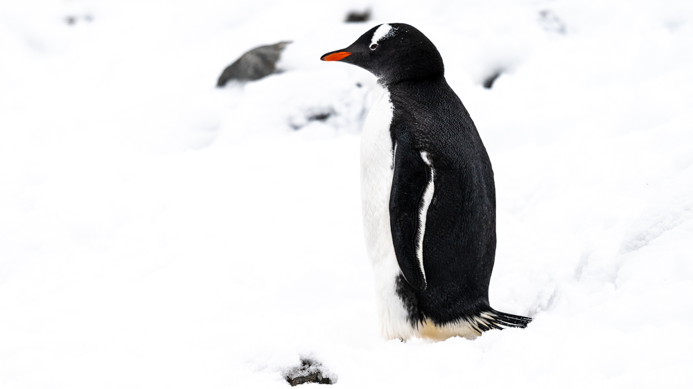 The beach and adjacent areas are crowded with Fur Seals, Skuas, Gentoo and some Adelie penguins. The latter have finished their breeding season leaving just a few moulting adults for us to see while the gentoos are in the final stages with many adult penguins changing feathers and chicks in downy plumage or freshly moulted into juvenile plumage are curiously investigating us. As the tide recedes rock pools emerge which are used by young gentoo penguins for safe swimming exercises. Caution is strongly recommended as a leopard seal waits camouflaged next to an iceberg close to the beach for unsuspecting penguins. We also have the opportunity to walk through the black and white landscape to the edge of a glacier where some of us see a large chunk of ice breaking of the ice-cliff.