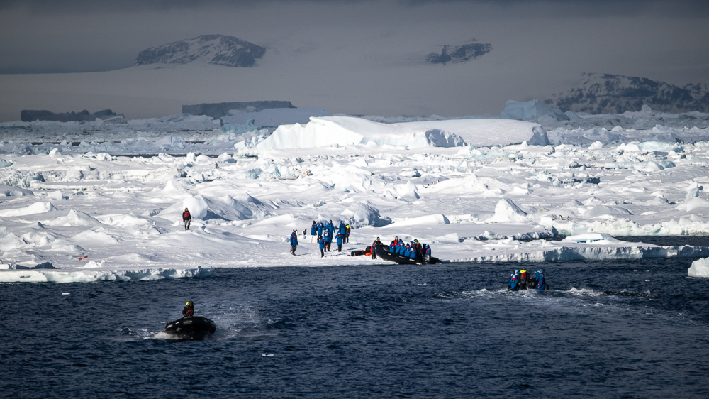 We turn around and Mario comes up with a new plan: We are landing on a sea-ice floe. The Zodiacs which almost drive onto the ice drop us off seemingly on another planet. We trudge