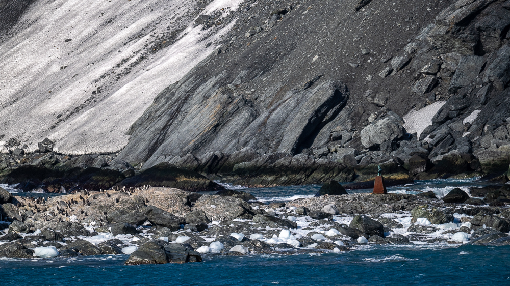 Shackleton’s shipwrecked Endurance expedition. Elephant Island is an ice-covered, mountainous island with a coastline of mostly inaccessible steep tidewater glaciers and cliffs. Point Wild is a small, low lying, narrow and rocky point on the north coast of the island and home to climbingadept Chinstrap penguins. The red and green bust of Captain Luis Pardo, a Chilean Navy officer, who rescued the 22 men of Shackleton`s crew after they had been stranded for 4,5 months on that small rocky point, is well visible in the sunshine at Point Wild.