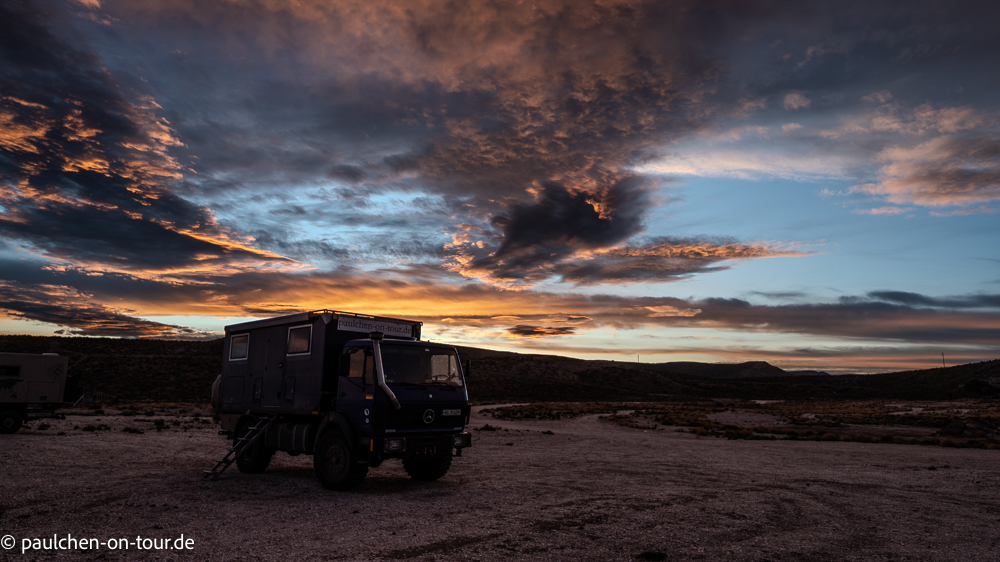 Für uns stand die Entscheidung an, wollen wir weiter auf der Ruta 3 nach Süden oder planen wir um und wechseln nach Westen, nach Chile. Die Wettervorhersage stand auf Sturm und auch weitere endlose Kilometer durch die Pampa reizten uns nicht sehr.