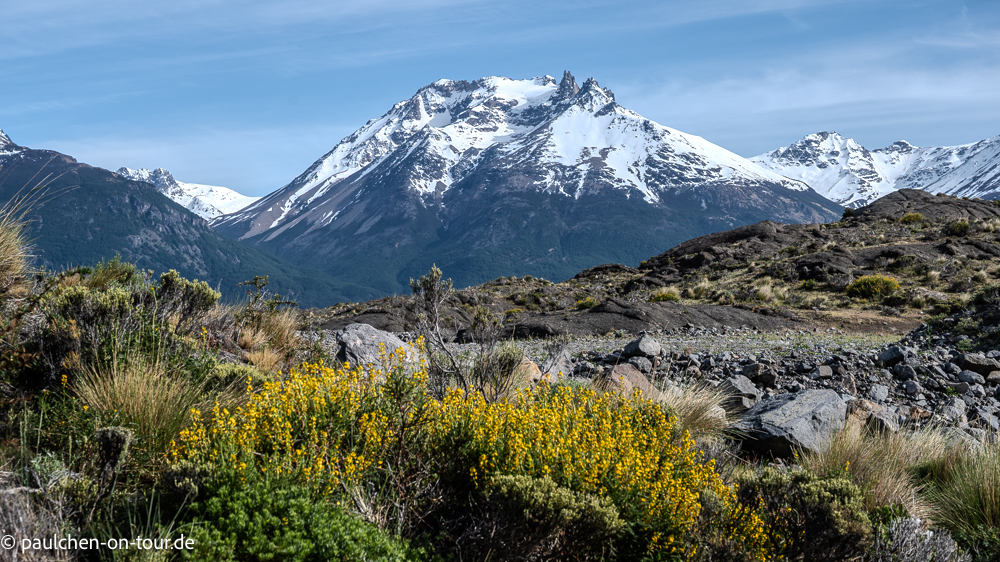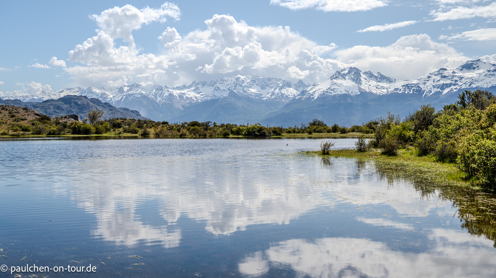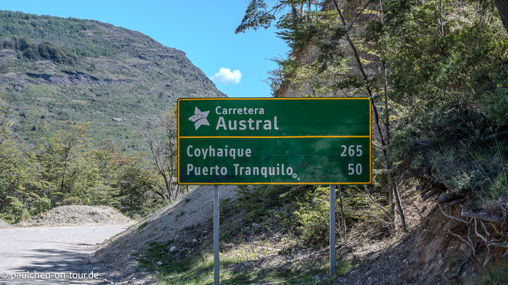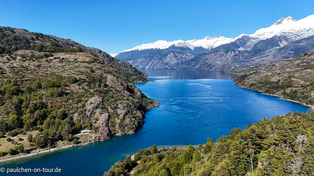 Direkt hinter der Grenze wurden in Chile Chico die Vorräte an frischen Lebensmitteln wieder aufgestockt. Das Beeindruckendste aber war, dass sich die Landschaft komplett verändert hatte, hohe Berge mit schneebedeckten Gipfeln, grüne Wiesen, Wälder und alles bei herrlichem Sonnenschein. Hinter jeder Kurve gab es ein neues Fotomotiv.