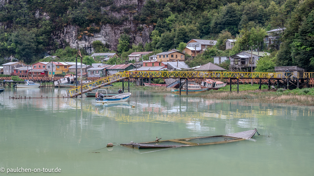 Bevor wir Puerto Yungay erreichten machten wir einen Abstecher nach Caleta Tortel, einem malerischen Dorf, das für seine Pfahlbau Architektur bekannt ist und in dem es statt Straßen Holzstege gibt. Die Piste führt zu einem zentralen Platz. Dort werden die Fahrzeuge abgestellt und weiter geht es über Stege treppab und treppauf zu den Wohnhäusern.