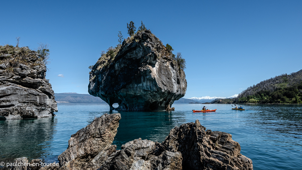 Wir folgten der Ruta 265 entlang des Lago General Carrera (bzw. Lago Buones Aires in Argentinien), dem zweitgrößten See in Südamerika, bis zur Carretera Austral und dann etwas nördlich bis nach Puerto Marmol. Hier unternahmen wir eine Bootstour im türkisblauen Wasser zu den Marmorhöhlen vor der Küste.