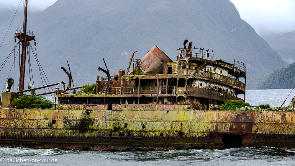 Bei unserem zweiten Halt abends in Puerto Eden hatten wir bereits 12 Stunden Verspätung und der Sturm ließ unsere Autos an Deck tanzen. Der Kapitän entschied in einer geschützten Bucht zu ankern und erst am folgenden Morgen weiter zu fahren. Schlußendlich wurden aus zwei Übernachtungen an Bord drei und statt 44 Stunden waren wir 67 Stunden unterwegs. Dennoch war die Stimmung an Bord gut und entspannt. Wir waren dem Kapitän und seiner Mannschaft dankbar für ihr umsichtiges agieren!
