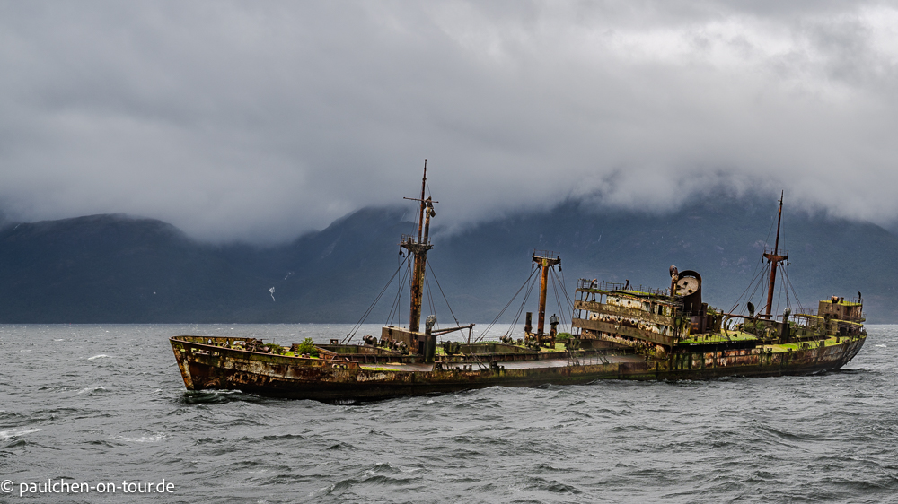Wir parkten unsere Autos vom Nachtplatz um in die sich langsam bildende Schlange. Inzwischen waren wir 5 Camper von deutschen Reisenden. Der Tag tröpfelte so dahin, ein Uniformierter checkte unsere Dokumente, später wurden die Fahrzeuge vermessen, dann gegen 17 Uhr mußte die Passage für das Fahrzeug bezahlt werden und dann… Endlich begann die Verladung, zuerst die Passagiere ohne Fahrzeug, dann nach und nach die Fahrzeuge, zwischendurch mal 3 Motorräder usw. Pünktlich um 19 Uhr war die Fähre beladen und voll, dann starteten wir Richtung Natales. Laut Fahrplan dauert die Fahrt 44 Stunden.