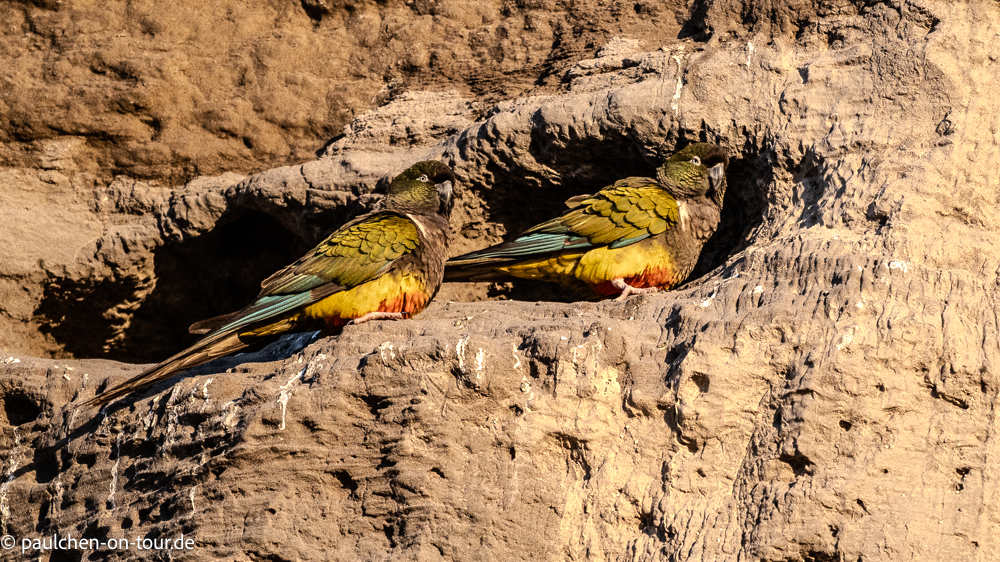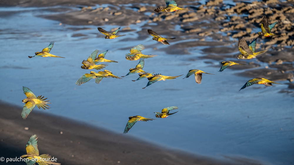 Schon im Auto hörte man das laute Krächzen der Papageien. In großen Trupps flogen sie über die Klippe, besetzten die Straßenränder und bevorzugt morgens und abends saßen sie aufgereiht auf den Stromleitungen.