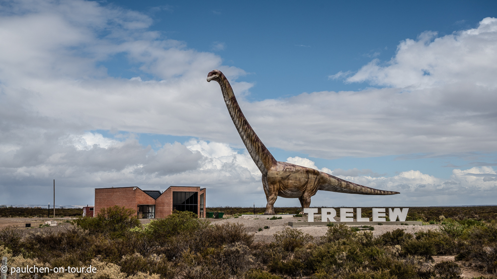 Weiter ging es auf der Ruta 3 (Teerstraße) durch die patagonische Steppe nach Süden, vorbei an einer Nachbildung von Patagotitan mayorum nach Trelew, das auf eine walisische Siedlung zurückgeht.