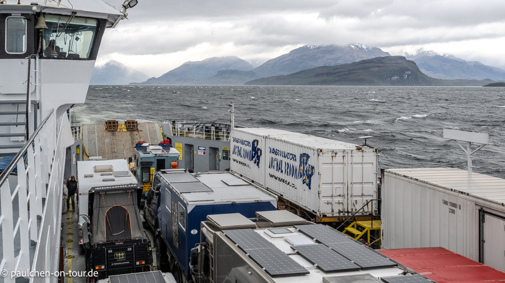 Wir parkten unsere Autos vom Nachtplatz um in die sich langsam bildende Schlange. Inzwischen waren wir 5 Camper von deutschen Reisenden. Der Tag tröpfelte so dahin, ein Uniformierter checkte unsere Dokumente, später wurden die Fahrzeuge vermessen, dann gegen 17 Uhr mußte die Passage für das Fahrzeug bezahlt werden und dann… Endlich begann die Verladung, zuerst die Passagiere ohne Fahrzeug, dann nach und nach die Fahrzeuge, zwischendurch mal 3 Motorräder usw. Pünktlich um 19 Uhr war die Fähre beladen und voll, dann starteten wir Richtung Natales. Laut Fahrplan dauert die Fahrt 44 Stunden.